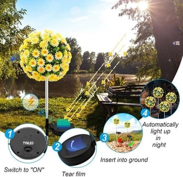 TWO MODE 7 COLOR LIGHTING: Daisy solar led outdoor lights with 7 color lights: red, green, orange, blue, yellow, purple, and white, the multicolored lights creating a surreal visual effect adds a charming display of lights, FLASHING and STEADY ON lighting two modes for choose make your surroundings look dreamy and magical.