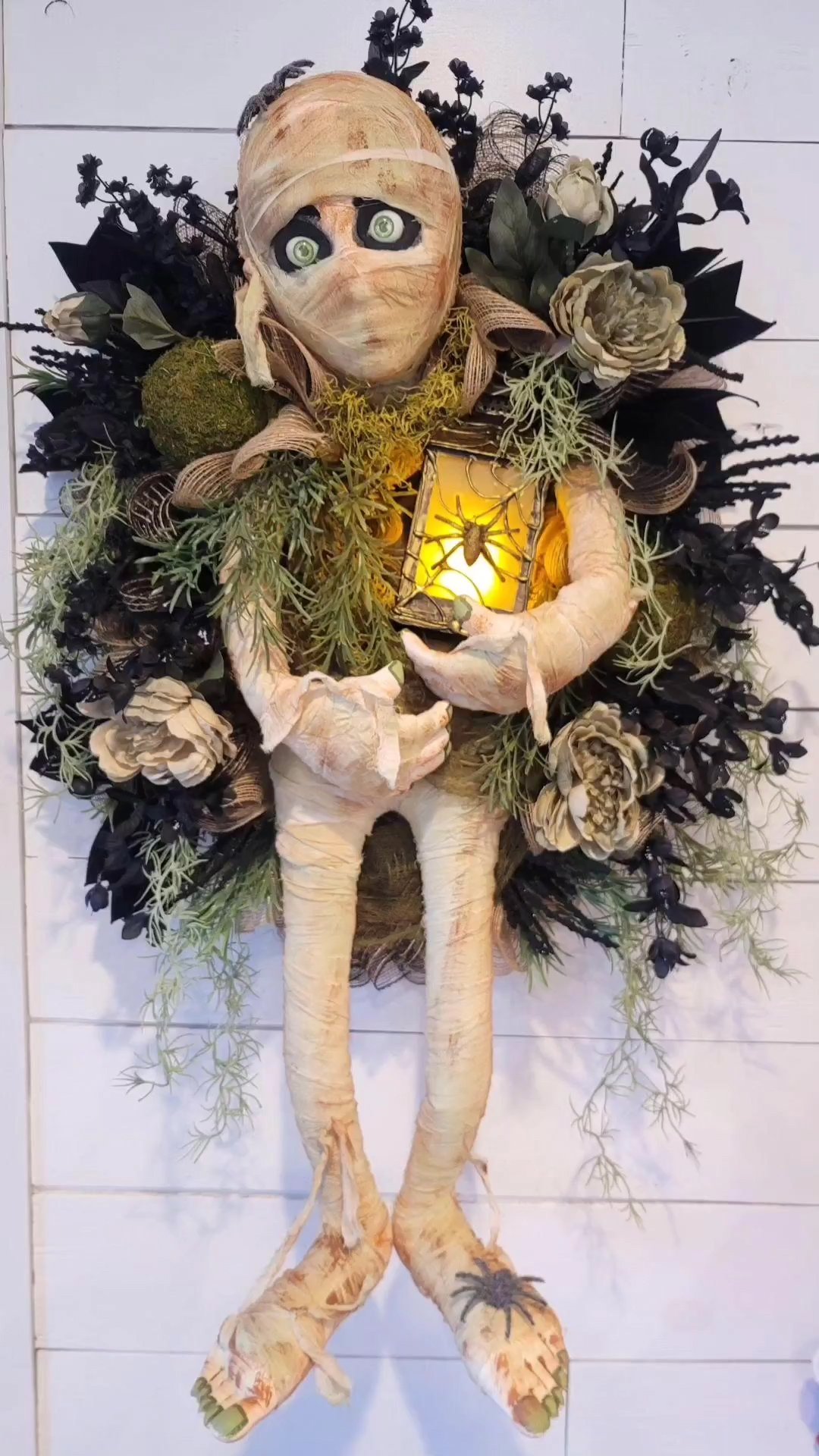 Our mummy wreath is not only a stunning decorative piece, but also a functional piece. Every night, the ghostly mummy holding a spider lamp in his hand becomes a unique sight at your front door,The lantern is battery operated.