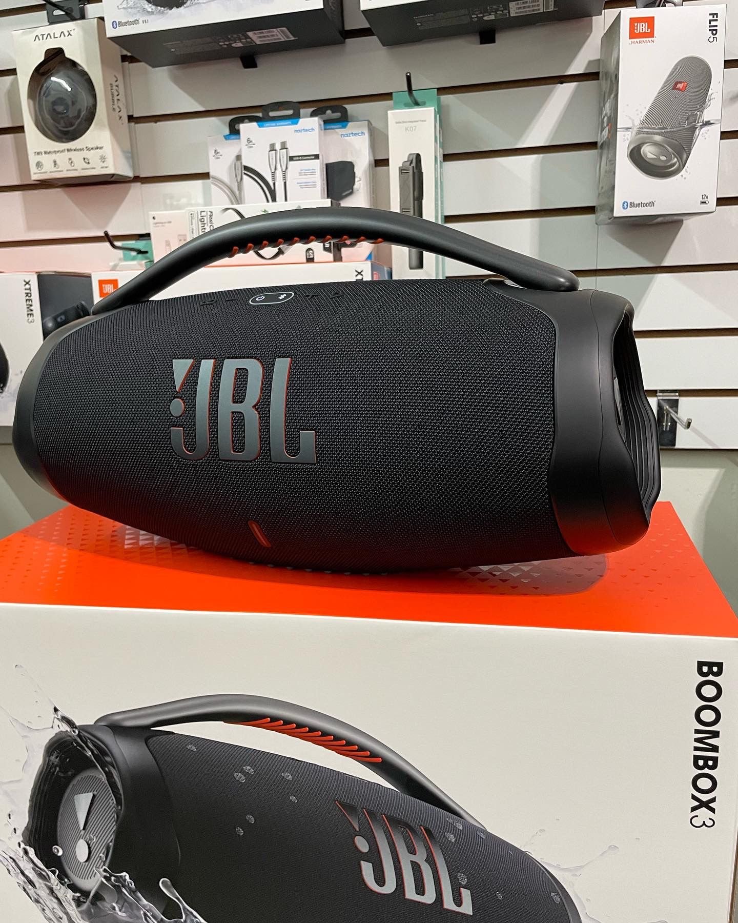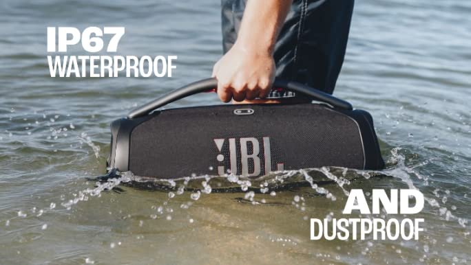 • IP67 dust and water proof: To the pool. To the park. The JBL Boombox 3 is IP67 dustproof and waterproof, so you can bring your speaker anywhere, rain or shine. Strong, bold design: We’ve updated the sleek, iconic JBL silhouette. With twin sidecaps and a sturdy metal handle with an eye-catching orange silicone grip, you can take your music—and your style—anywhere.
