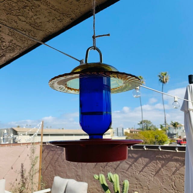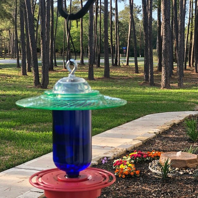 This Bird feeder has a 8 oz Clear or Cobalt Blue Round for Sugar Water and makes a great Humming Bird Feeder