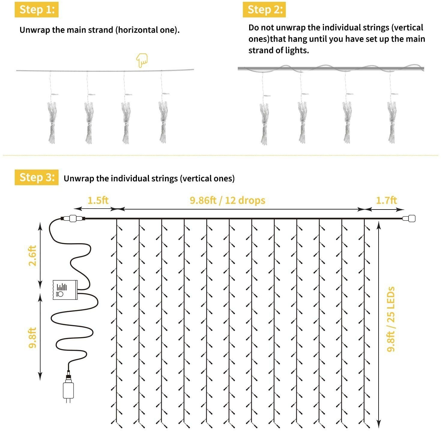 - Easy Installation: Please do not unwrap the individual strings until you have set up the main string of lights. Lighted Length: 9.8ft ×9.8ft. Adjust distance between strings with zip tie for a double layer to fit your needs and make the lights look better.