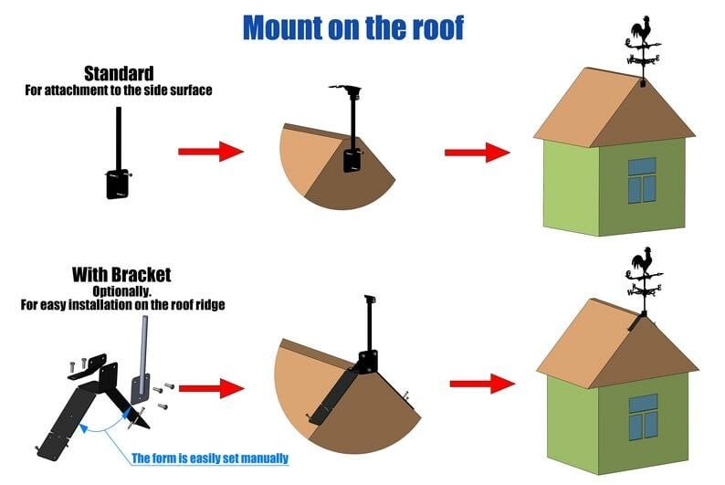 Each weathervane has a special roof mount. This size weathervane is ideal for your home, garage, cupola, barn, lawn, patio, garden, backyard, or gazebo.
